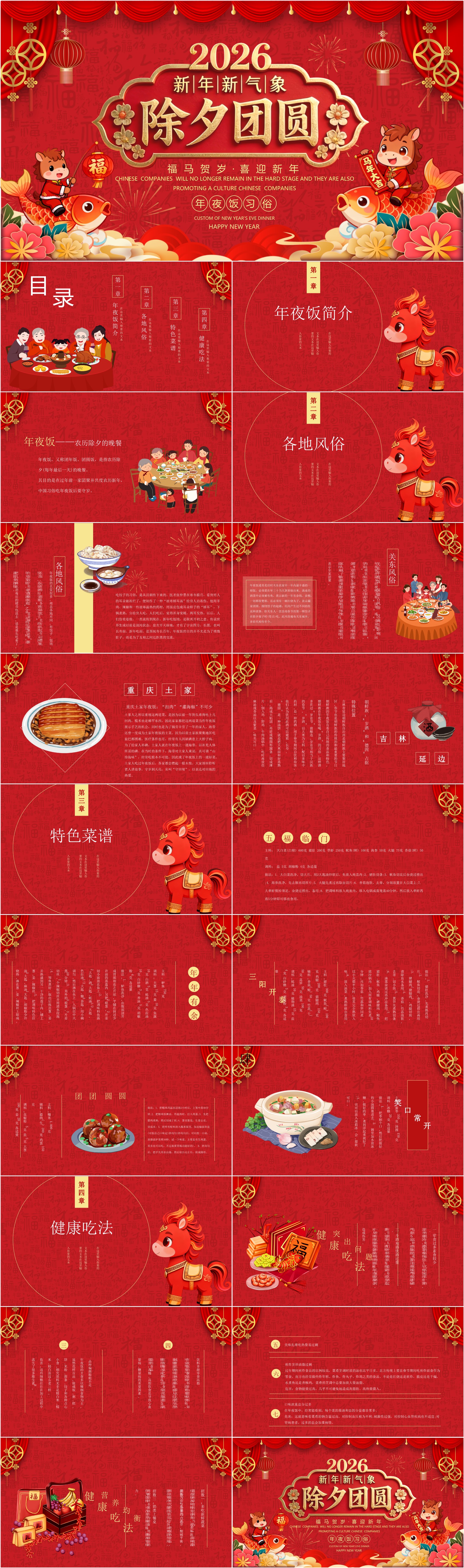 马年除夕团圆PPT红色中国风除夕夜年夜饭习俗模板下载